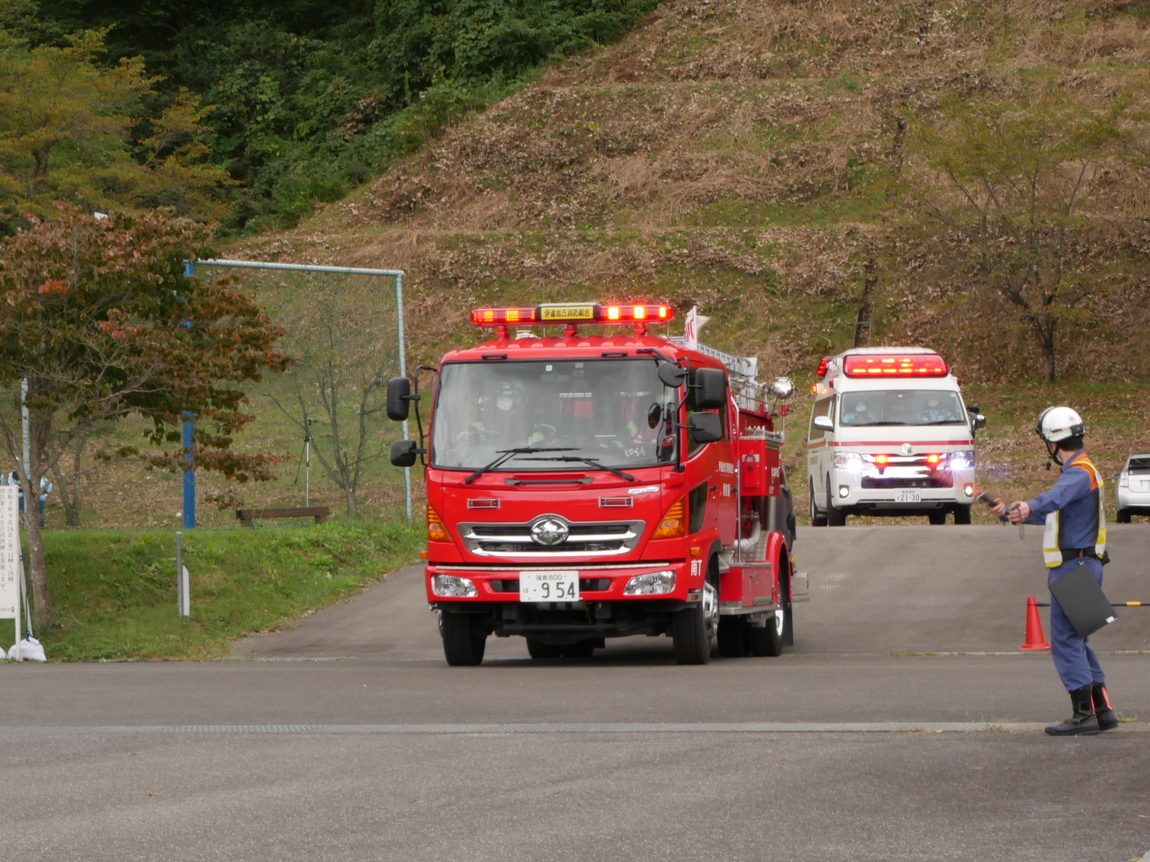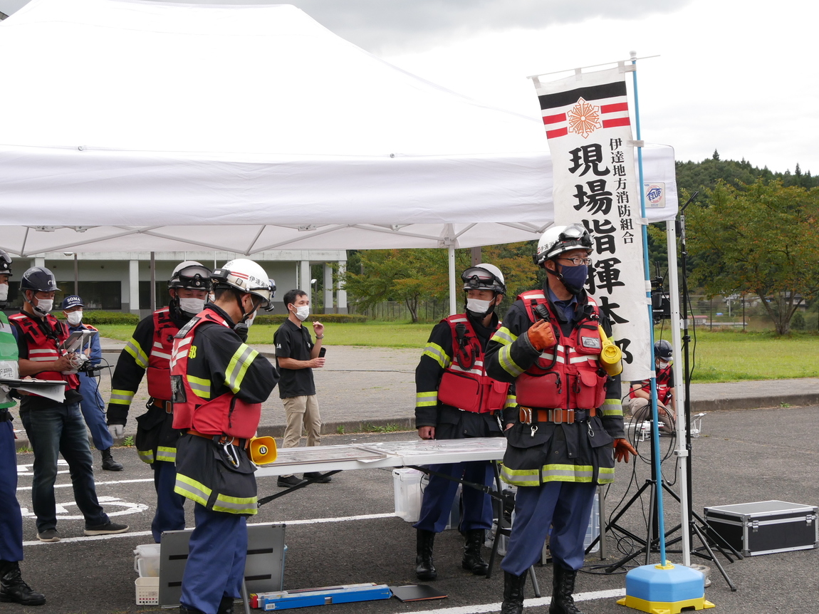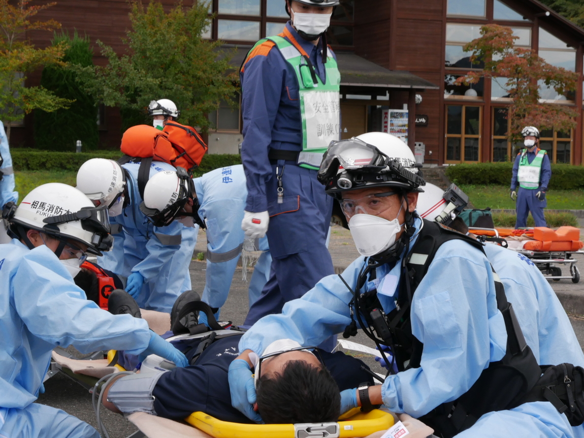 福島県消防広域応援基本計画に基づく広域消防応援(隣接等応援)による集団救急事故対応と広域連携の強化を図ることを目的に、隣接する福島・安達・伊達・相馬の県北・相馬の4消防本部とDMATや医療機関、関係機関が協力し、川俣町体育館を会場に実施されました。