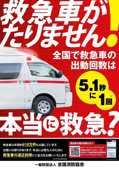 緊急性のない救急出動中に、本当に必要な傷病者からの救急要請があることも考えられるので、救急車の適正利用をお願いします。