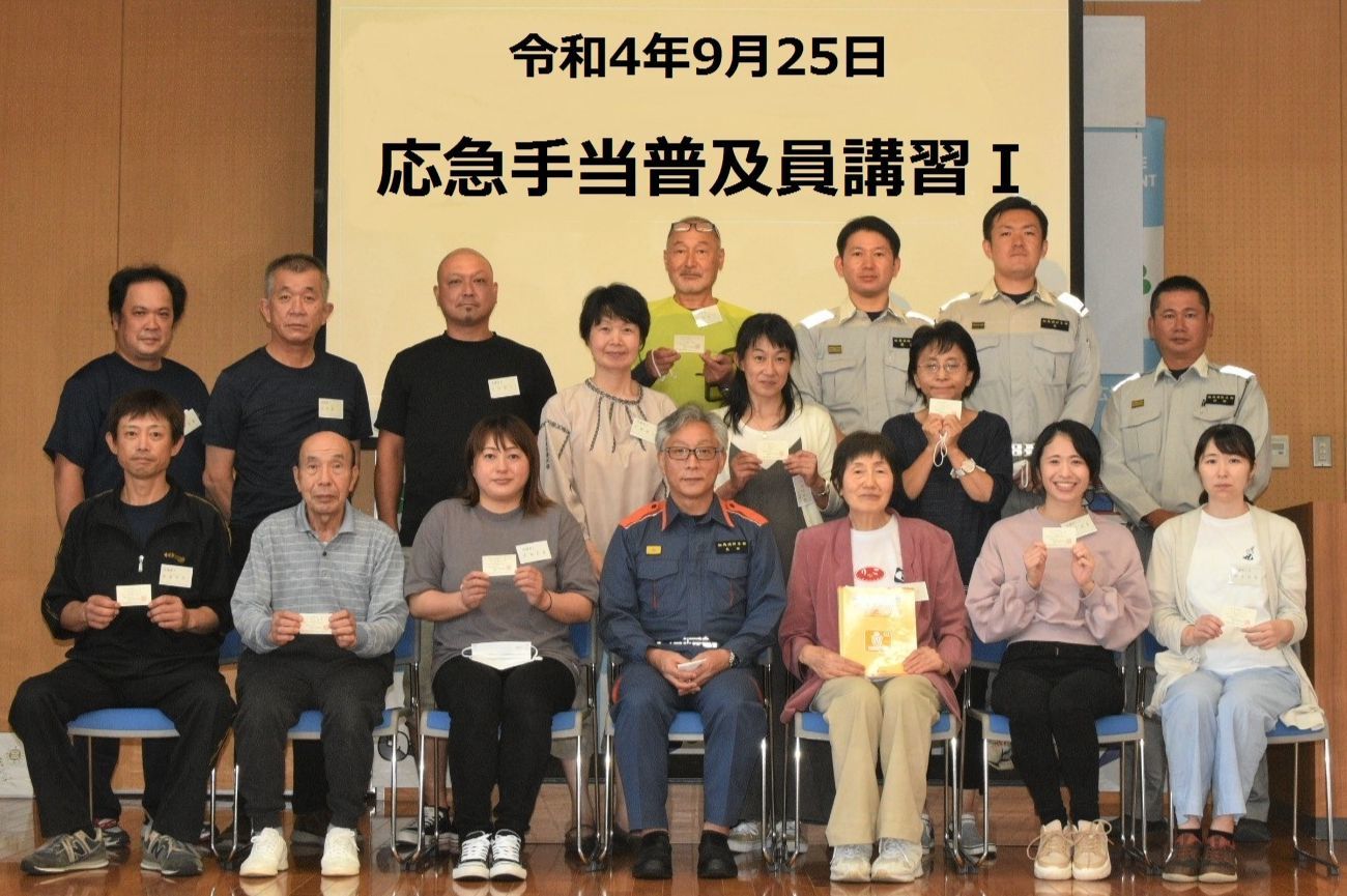 講習会では、基礎的な応急手当の知識と、心肺蘇生法やAEDの使用方法、止血法などの実技、心肺蘇生法の指導要領、効果測定、救命講習会での指導など4日間で合計24時間の講習を行いました。最終日の9月25日に受講者13名全員に応急手当普及員認定証を交付して、新たな応急手当普及員13名が誕生しました。