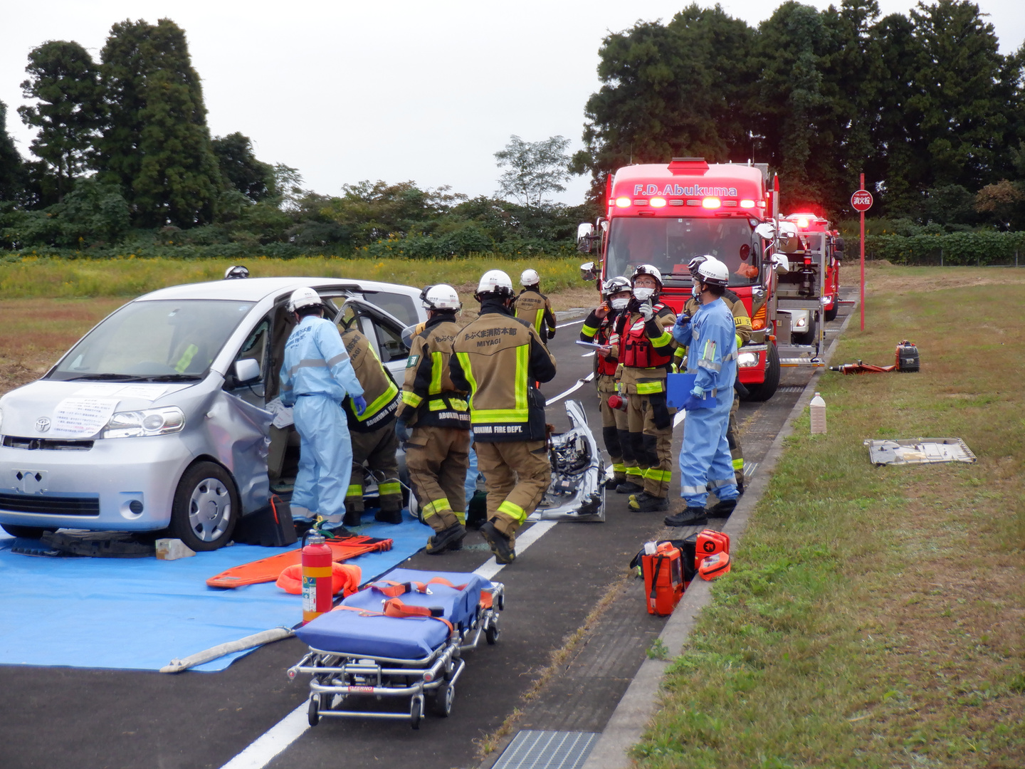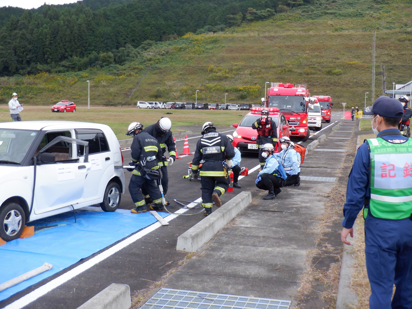 本訓練は常磐自動車道上県境付近で車両2台による衝突事故を想定とし、両消防本部の救助隊・救急隊・消火隊による連携・協力し現場活動にあたりました。実際に車両を破壊し救出、救急搬送の一連の活動を行いました。