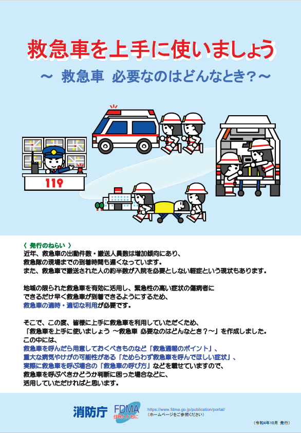救急車を呼んでほしい症状等をまとめたマニュアルを消防庁が作成していますのでご活用ください。