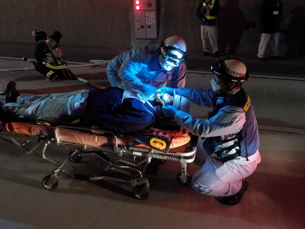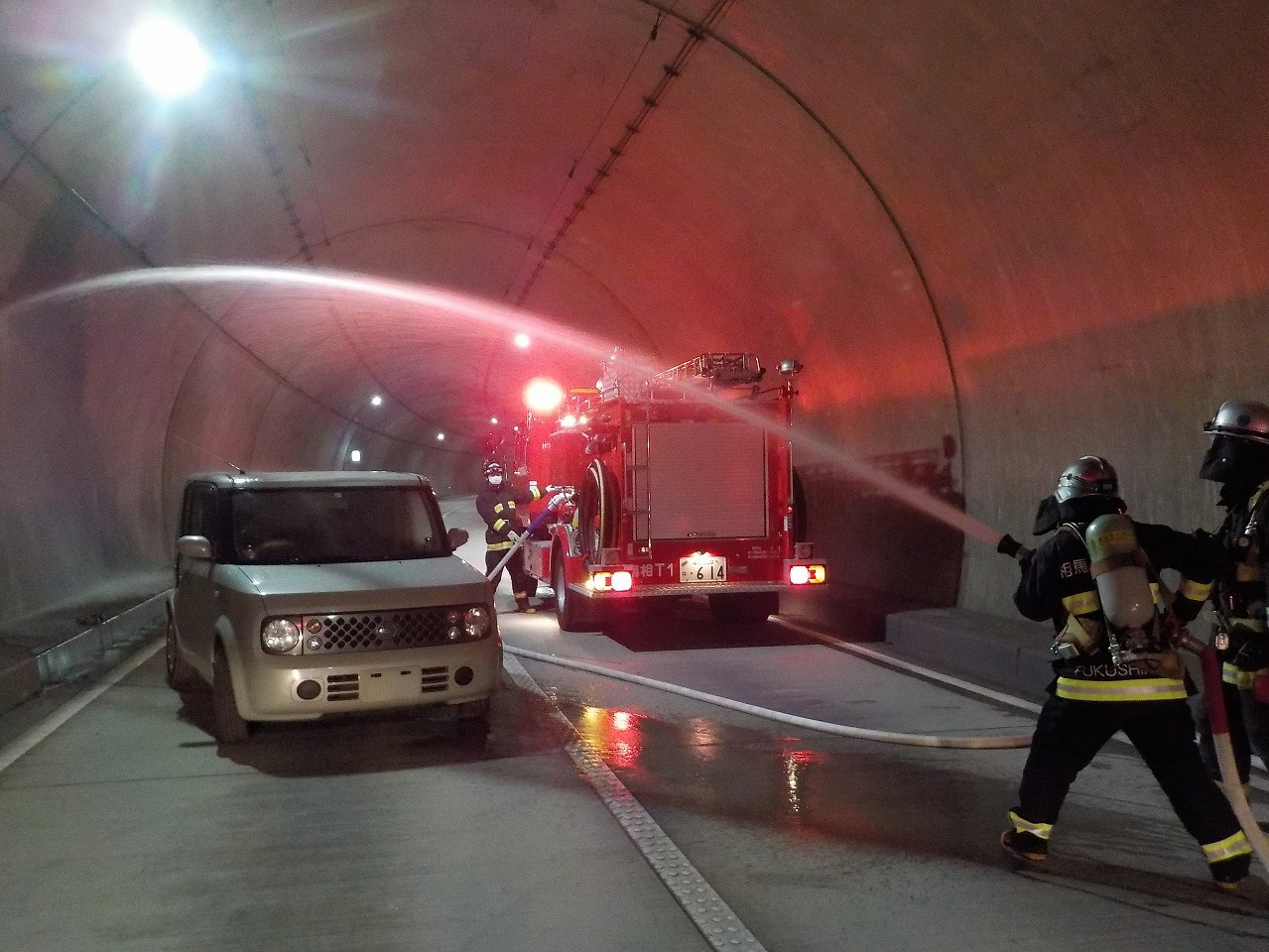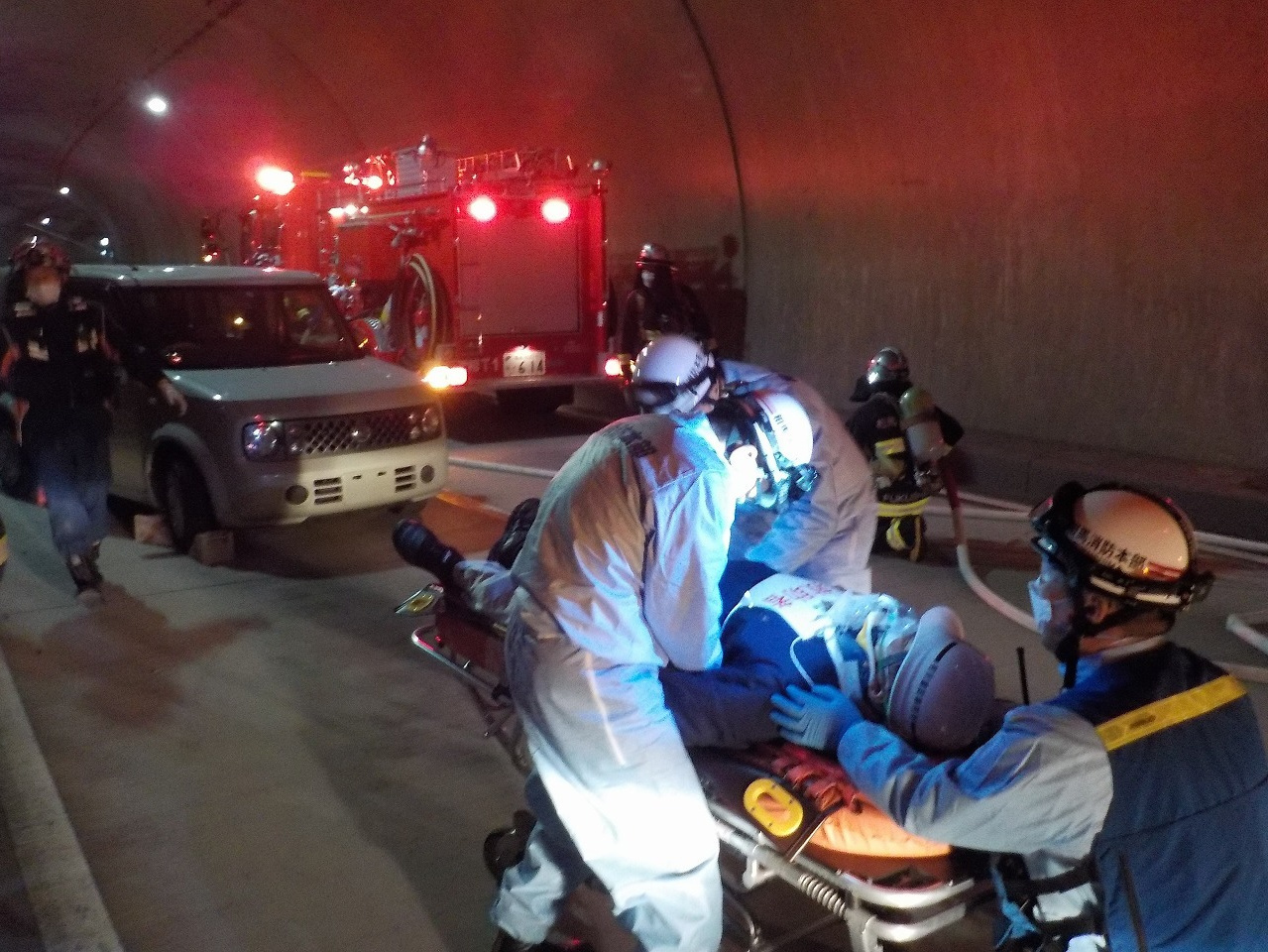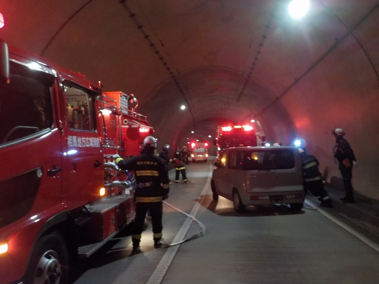 この訓練では、トンネル内で交通事故が発生したことを想定し、福島県相双建設事務所、南相馬警察署、相馬消防本部が参加し、避難誘導、情報伝達及び救出活動等の互いの連携活動を行いました。