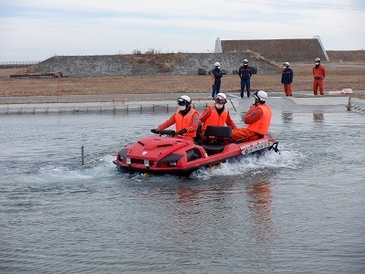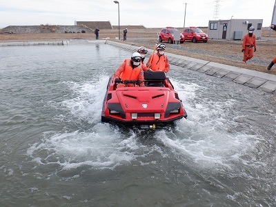 この訓練は、当消防本部に配備された津波・大規模風水害対策車積載の水陸両用車(バギー)を使用し、緊急消防援助隊登録隊員が災害現場で迅速かつ安全に運用することを目的とし訓練を行いました。