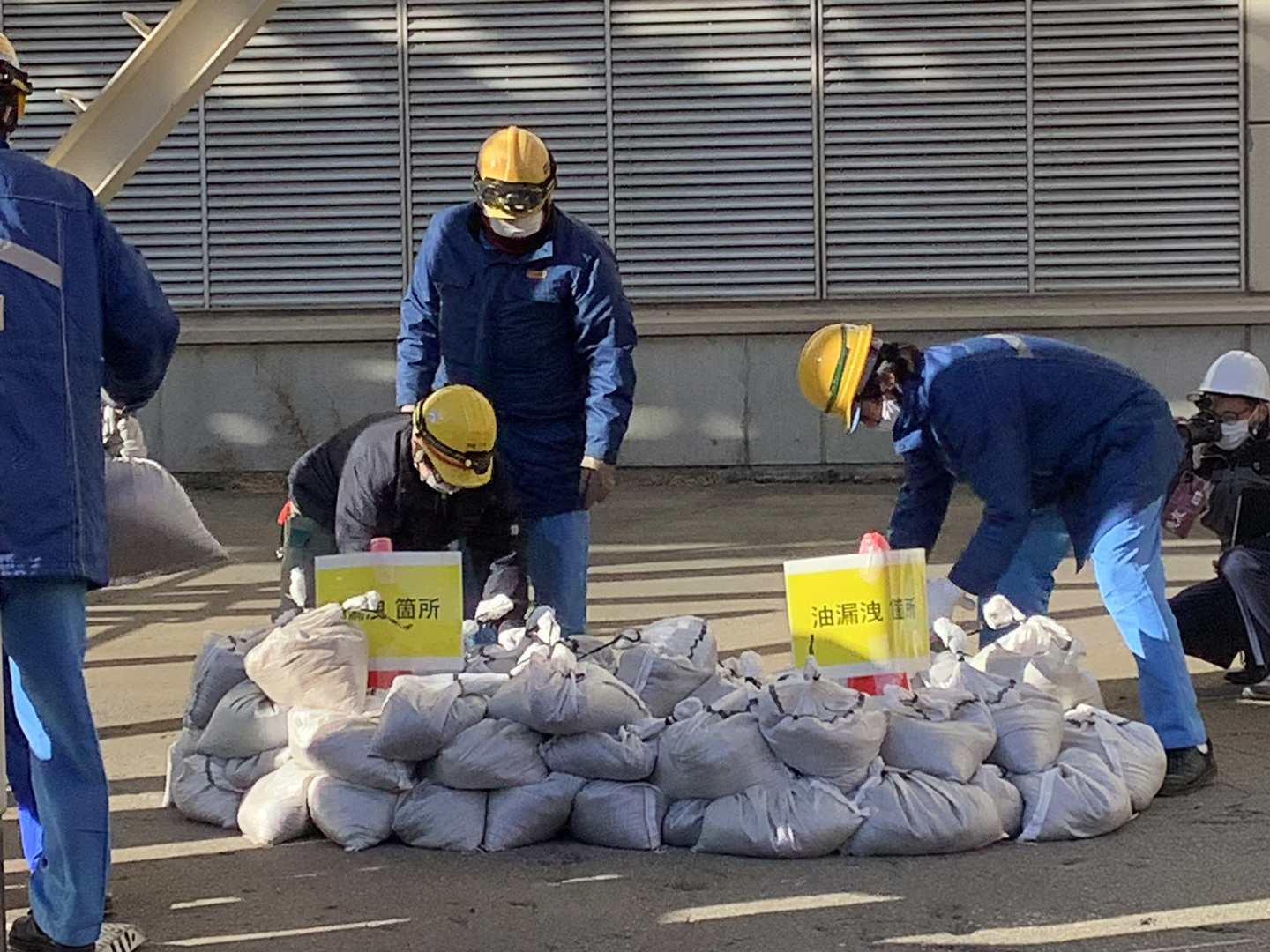 この訓練は、福島県で震度6弱の地震が発生し、燃料油漏洩(陸上及び海上)ならびに建物から出火したと想定し、地震津波による避難訓練、危険物漏洩によるオイルフェンス展張訓練、土のう積み訓練、火災発生時の消火訓練を行いました。