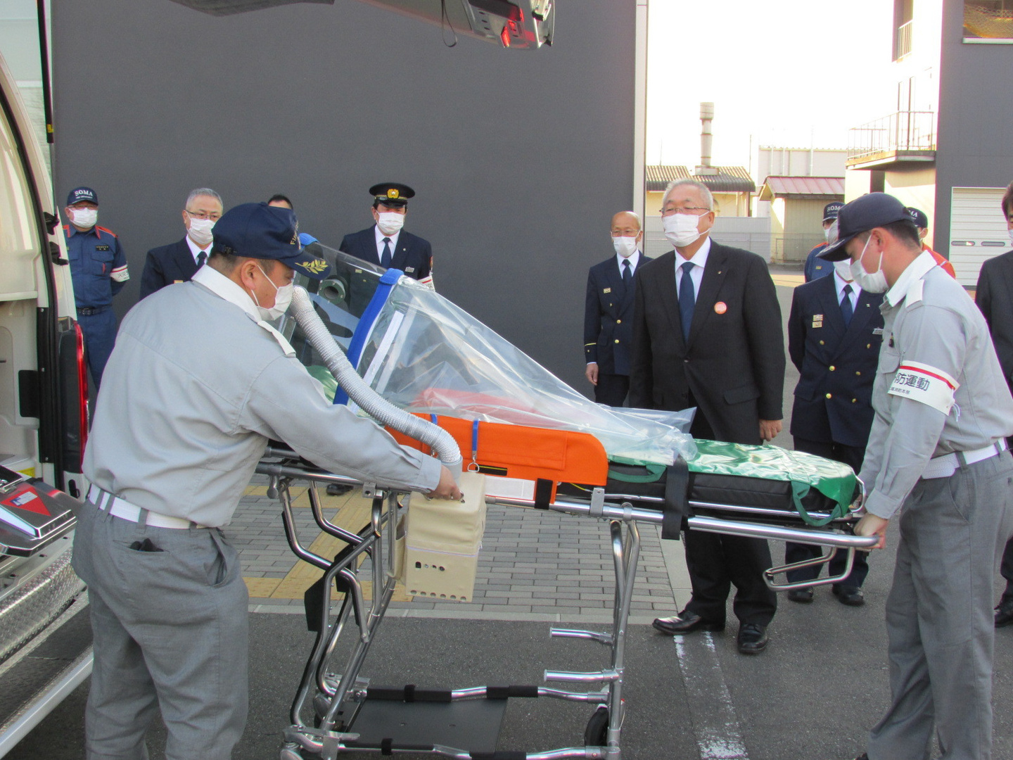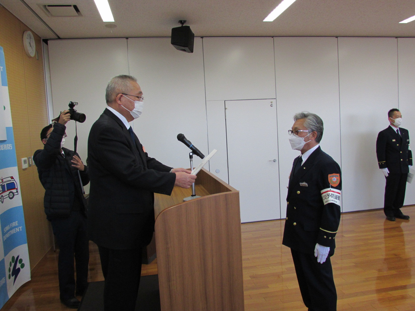 相馬地方広域市町村圏組合管理者である門馬和夫南相馬市長から交付を受けた太田消防長は、相馬地方圏域住民の安心安全のために有効活用することを誓い、河村南相馬消防署長に配車を行いました。