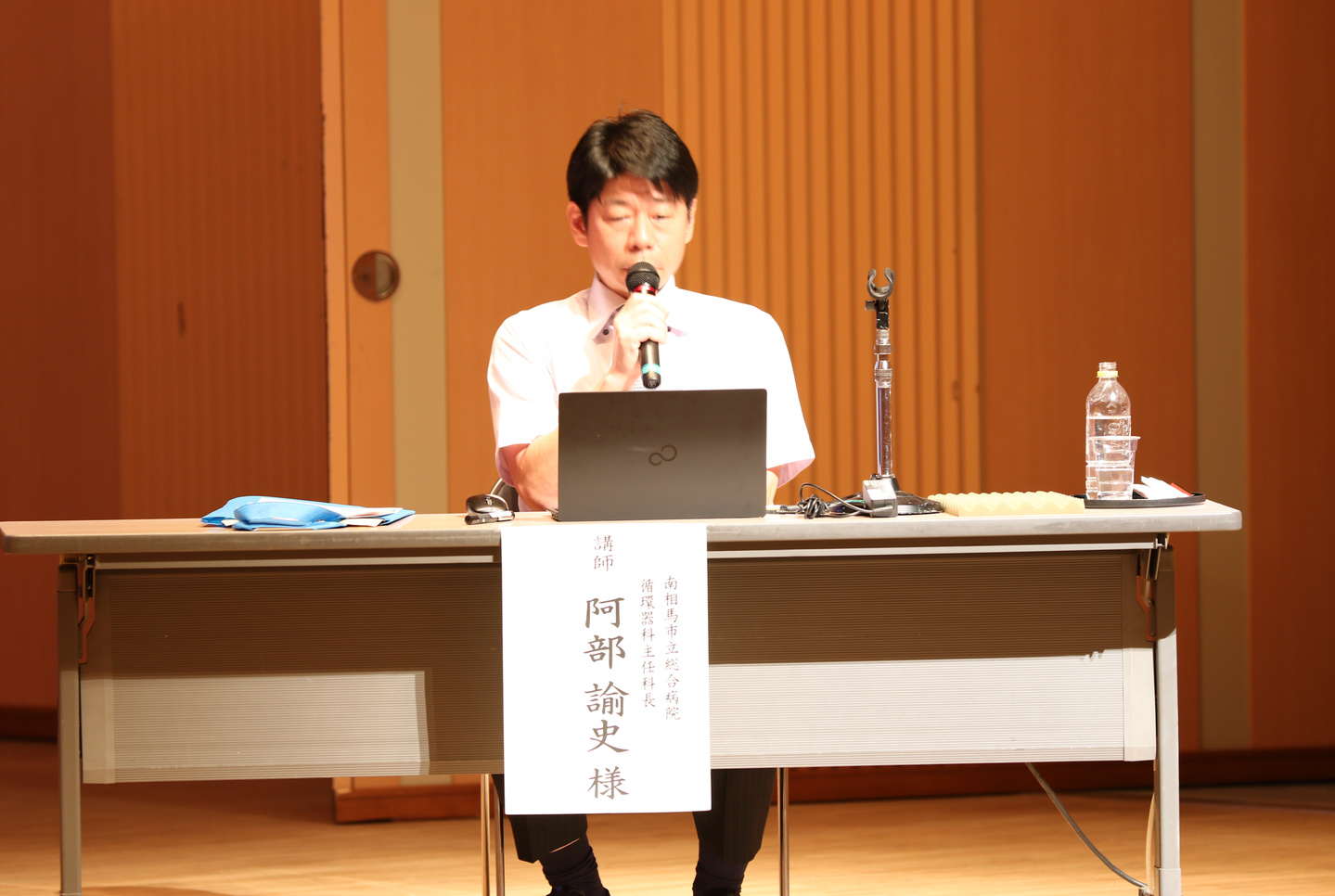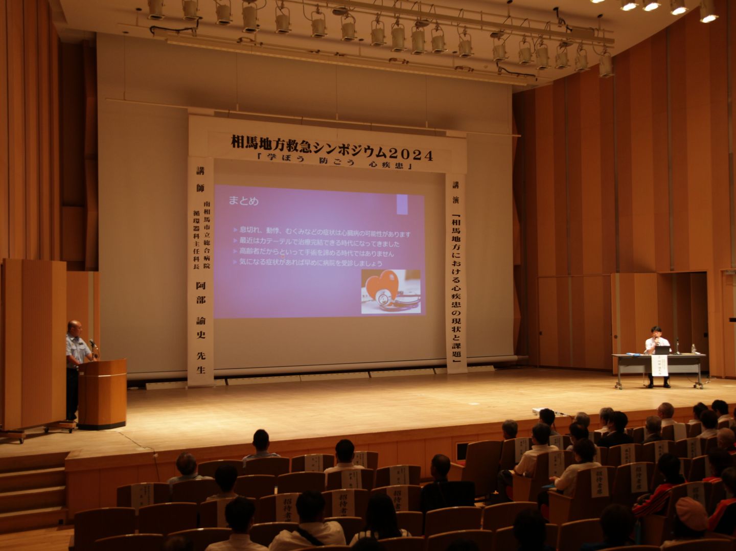 2024」を開催いたしました。今回は「学ぼう 防ごう 心疾患」をメインテーマに、南相馬市立総合病院 循環器科主任科長 阿部諭史 先生を講師にお招きし、「相馬地方における心疾患の現状と課題」と題し、ご講演を頂きました。また、当消防本部からは「相馬地方の救急現状について」の題目で、救急業務の現状と救急電話相談の有効活用についての発表を行いました。当日は約