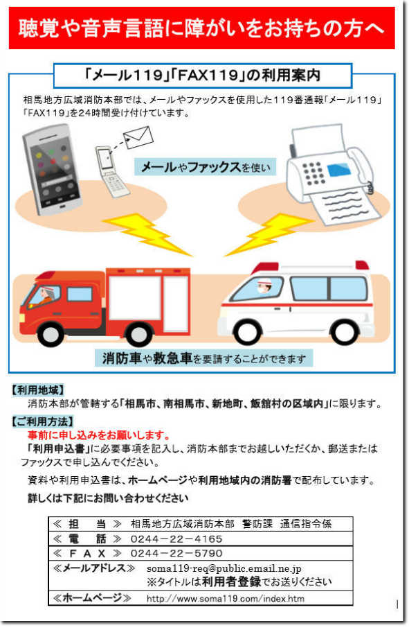 聴覚や音声言語に障害をお持ちの方々を対象に安心と安全を提供するため、登録をされたかたを対象にメールとFAXを使用した119番通報「メール119」と「FAX119」を24時間受け付けています。